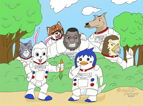 This drawing pays tribute to the after-episode segment that began airing late during Space Brothers' run: Mr. Hibbit. Mr. Hibbit is a light-hearted series of children's anime shorts chronicling the adventures of anthropomorphized woodland creatures on a quest to become astronauts. I felt my penguin avatar would mesh perfectly into this world of astronautical critters, so I donned him in the suit and sent him to town. Often in my drawings I find myself spending a considerable amount of time on shading and after-effects; it was nice to work on one that purposefully avoided such intricacies for a change. Bright, colorful, and positive, it warms my heart just as much as Space Brothers and Mr. Hibbit does. So I'm quite happy with how it turned out. I think my favorite is Freddie Dog. He always looks so cool.